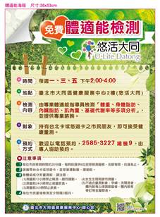 大同區健康服務中心2樓「悠活大同」健康關懷服務空間,提供多項高齡服務設施。另於每週一、三、五下午2時至4時提供體適能預約檢測服務,檢測項目包括身體組成分析、握力、30秒坐站及2分鐘踏步,讓您了解身體年齡及實際年齡的差異,歡迎市民朋友前來參觀及檢測! ※洽詢及預約電話:2585-3227轉9