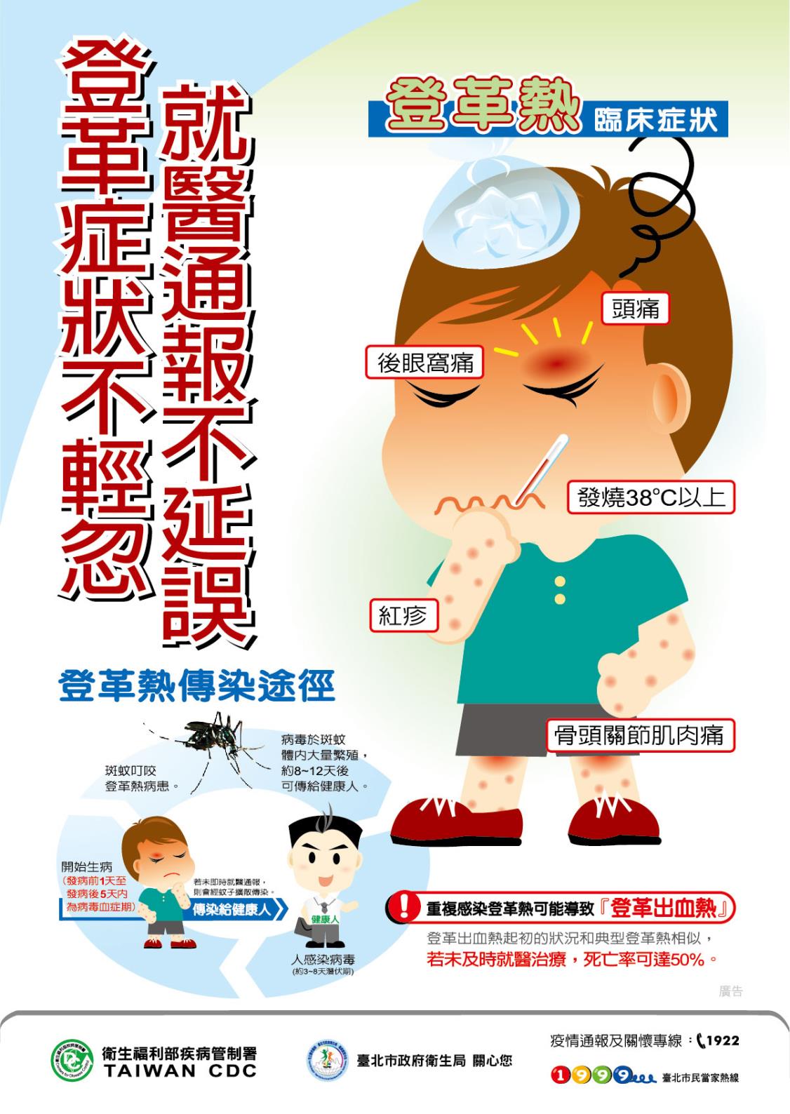 若有登革熱防治與通報相關問題,可撥打臺北市政府衛生局防疫專線2375-3782或臺北市民當家熱線1999,將有專人服務。