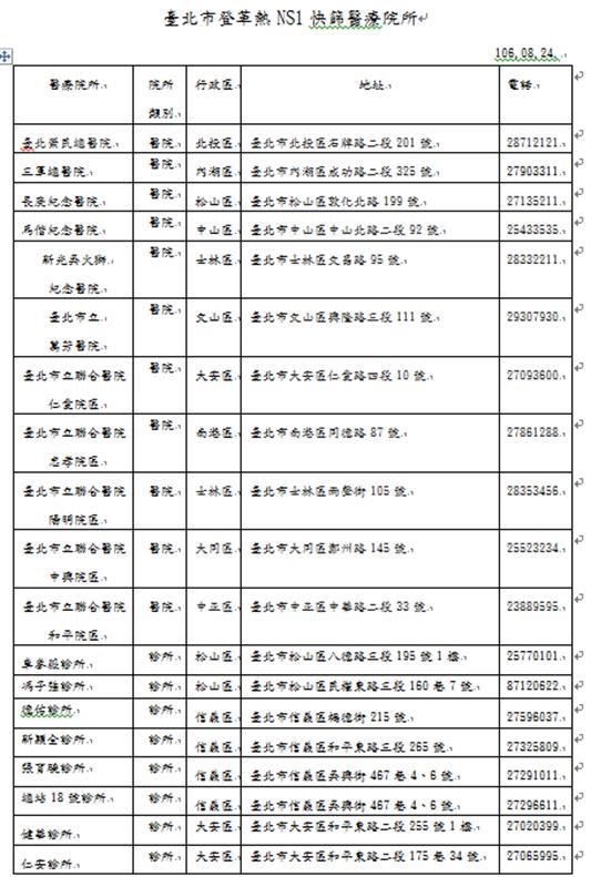 臺北市政府衛生局自今(106)年5月1日起推動「建構登革熱防疫網,社區診所快篩通報」,為強化基層醫師之防疫網絡及就醫分級政策,臺北市原僅11家區域級以上醫院配置登革熱快篩試劑,自今(106)年5月1日起至今新增30家社區診所加入運作,透過便捷快篩檢測,提早發現隱藏於社區之登革熱個案,於第一時間執行必要性之防疫措施,有效防制疫情。
