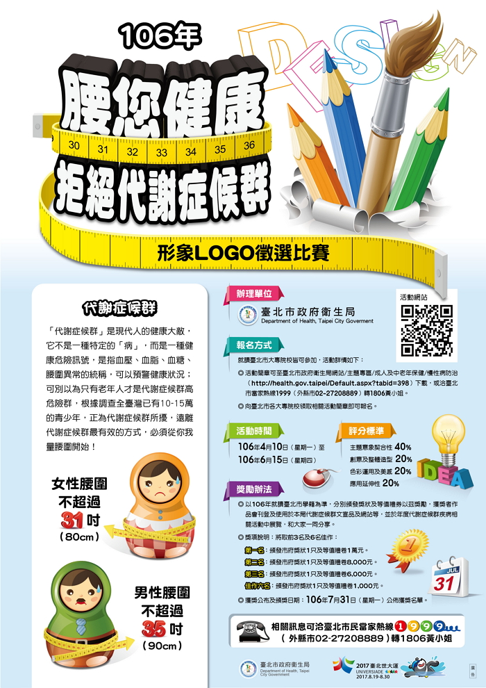 為強化臺北市大專院校學生重視,進而提升18歲以上市民對腰圍警戒值認知率之目的,臺北市衛生局106年舉辦「腰您健康-拒絕代謝症候群形象Logo徵選比賽」,歡迎熱情有活力又具天馬行空無限想像創意的大專院校在學學生們積極參加!活動時間自106年4月10日(星期一)起到106年6月15日(星期四)止,獎勵辦法除第一名可獲得10,000元等值禮券以茲鼓勵,獲獎者作品會刊登及使用於衛生局代謝症候群文宣品及網站等,徵選結果將於106年7月31日以電話方式通知得獎者,同步公佈於臺北市衛生局網站(http://health.gov.taipei/Default.aspx),相關活動詳情及報名表下載請至臺北市衛生局網站facebook搜尋「智慧台北 幸福生活」,亦可來電洽詢02-27208889轉1806黃小姐。