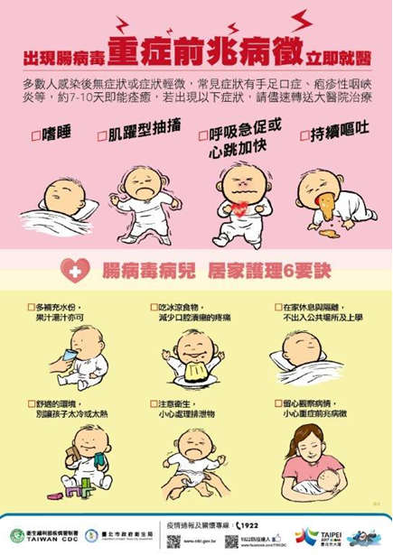 夏天是腸病毒活躍的季節,大人小孩都應注意「看病後、接觸幼兒前、吃東西前、如廁後及擤鼻涕後」應洗手,落實正確洗手5步驟:濕、搓、沖、捧、擦,即可有效降低感染機會。 臺北市政府衛生局提醒家長,如家中幼童出現發燒、嘔吐、疱疹性咽峽炎、手足及口腔出現小紅疹或水泡等疑似腸病毒症狀時,應儘速就醫避免病情惡化,並請假在家休息,以免傳染其他孩童。如出現腸病毒重症前兆病徵,例如「持續發燒、嗜睡、意識不清、活力不佳、手腳無力、肌抽躍(無故驚嚇或突然間全身肌肉收縮)、持續嘔吐與呼吸急促或心跳加快」等,務必儘速至腸病毒重症責任醫院( http://goo.gl/z4O6Qs )或大醫院就醫,以免錯過治療的黃金時間。