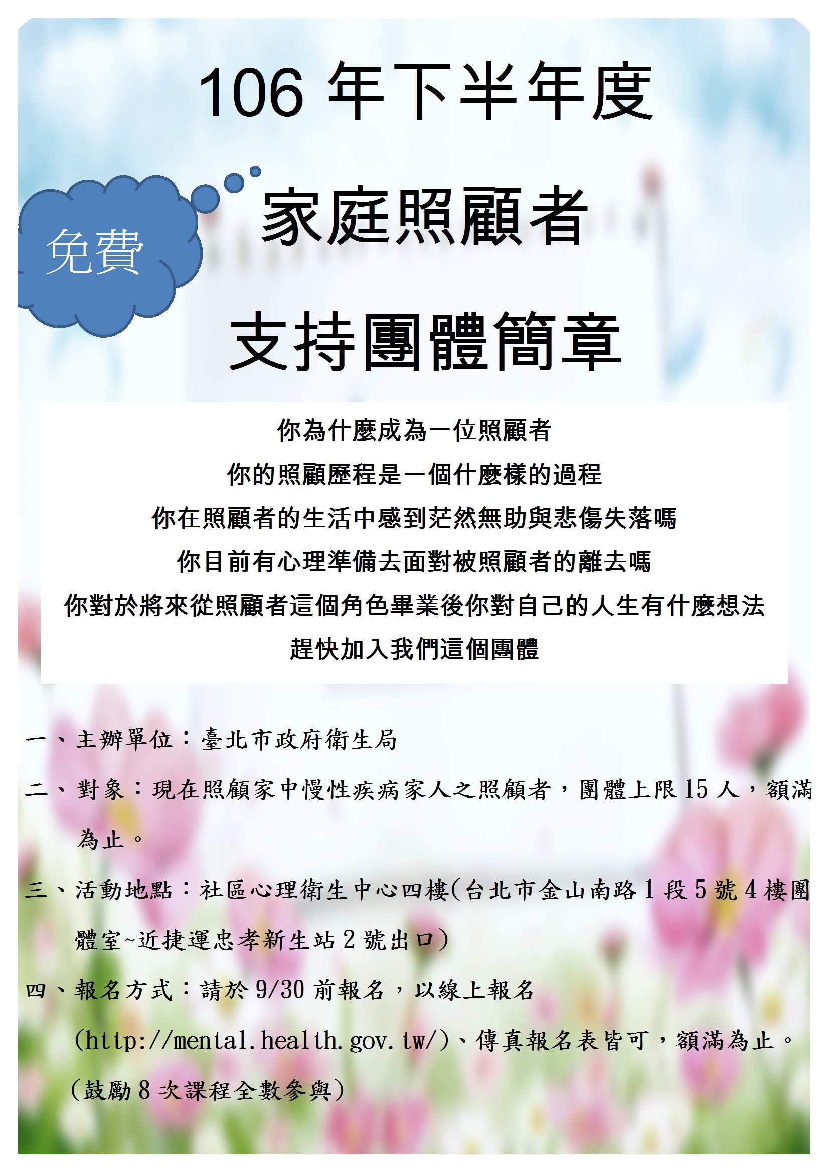 四、報名方式:即日起開始報名,9/30截止報名,以線上報名(http://mental.health.gov.tw/)、傳真報名表皆可,額滿為止。