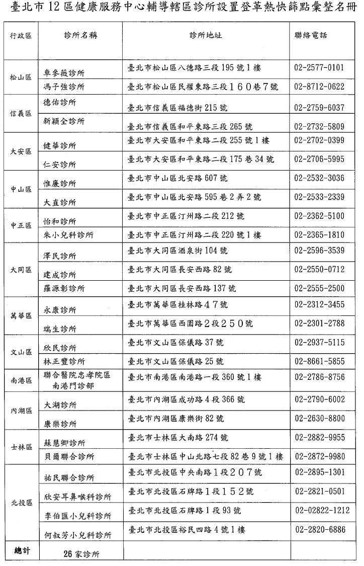 臺北市政府衛生局自今(106)年5月1日起推動「建構登革熱防疫網,社區診所快篩通報」,為強化基層醫師之防疫網絡及就醫分級政策,臺北市原僅11家區域級以上醫院配置登革熱快篩試劑,自今(106)年5月1日起新增26家社區診所加入運作,透過便捷快篩檢測,提早發現隱藏於社區之登革熱個案,於第一時間執行必要性之防疫措施,有效防制疫情。